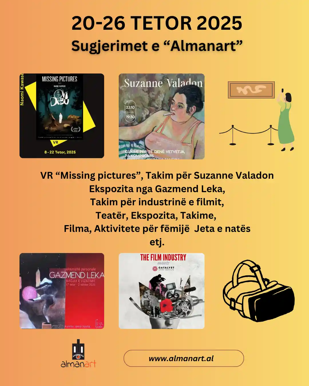 Ekspozitat gjatë javës do të jenë: VR “Missing pictures” te “KubFranceTirana” Piramida, Ekspozitë “No Art Zone” nga Vladimir & Noel Myrtezai, Ekspozita “Shqipëria 1921 – Eugène Pittard”, Ekspozita “Magjia e vizatimit” nga Gazmend Leka te Galeria “FAB” Tiranë, Ekspozita nga Jutta Benzenberg “Don’t Look Back at the Burning House”, Ekspozita “Here and now” nga Verim Zendeli, Ekspozita “Living Walls” te “Catalyst Story Institute” Tiranë, Ekspozita “Diell në Fijet e Barit” nga Blerta Hashani, URAT MESDHETARE – BIENALIA E 6-të NDËRKOMBËTARE E AKUARELIT NË TIRANË, Ekspozita “Gurët dhe Kristalet e Shqipërisë në Stoli Artizanale, Ekspozita “SHIFTING VIEWS” nga grupi STUBRN, Ekspozita “Ndjesi” nga Emjona Stasi te Galeria “Nikolet Vasia” Durrës, Ekspozita “Borrowed skins” nga Idlir Koka te “Shkodra Arthouse” Shkodër.