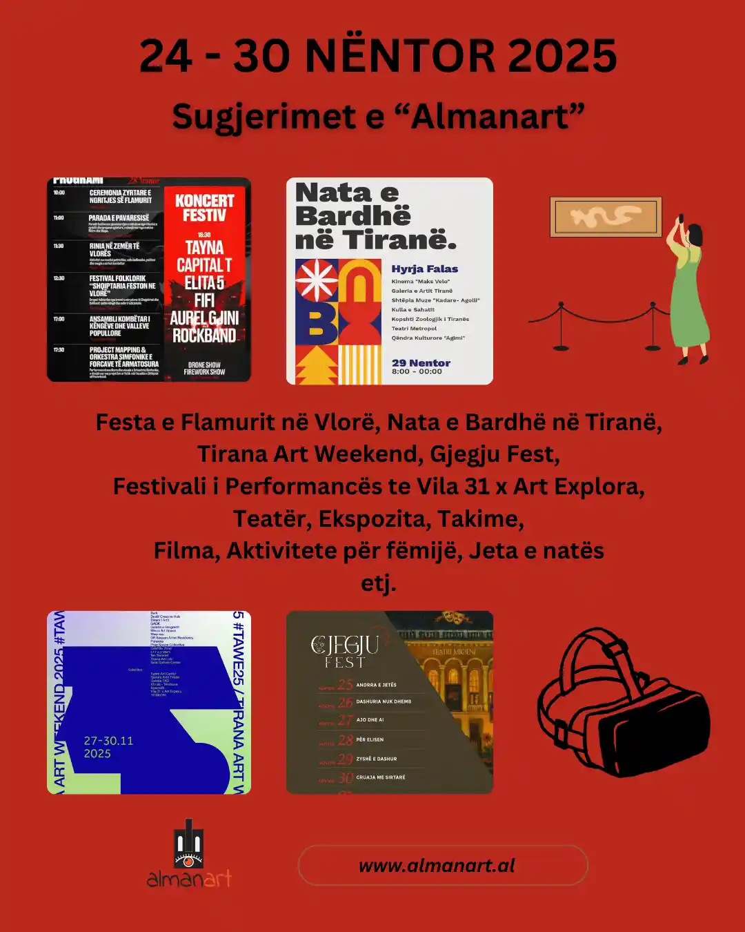 Ekspozitat gjatë javës do të jenë Tirana Art Weekend 2025, Ekspozita “Qoftë e shëndetshme dora që krijon – Shqipëri & Azerbaixhan” te “Galeria e Artit” Tiranë, Ekspozita “Nëntori 28” te Galeria “FAB” Tiranë, Ekspozita “TAL – Pop Up “Between Shores” nga Muhamet Spahiu, Ekspozita “Range” nga Richard Deacon, Ekspozita “Living Walls” te “Catalyst Story Institute” Tiranë, Ekspozita “Method and praxis: Manifesto Collective + Border Forensics”, Ekspozita “Pëshpërima nën Marshimin e Pamëshirshëm” nga Blerta Hoçia, Ekspozita “Let Us Meet in Between” nga Ledia Kostandini te Pallati me Kuba – poshtë Studio Kadare, Ekspozita “Prani” nga Ergys Zhabjaku te Piramida, Ekspozita “Gjurmë penelatash” nga Arben Kristani në Durrës, Ekspozita Fotografike “Aromë Hungarie” nga Roland Tasho në Korçë, Ekspozita “Arti i fijes në jelekë – Elegancë që magjeps” te Muzeu Historik Shkodër, Ekspozita “Ngjyra që shërojnë” në Shkodër, Ekspozitë: TRADICIONALJA NË AKUAREL te Galeri ODA, Shkoder.
