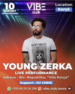 I ftuar @youngzerka E Shtune 10 – Shkurt 🕗 20 : 00 Rezervime📞 0692926296 📩 Dm Instagram @vibe_club_korce Jeni te Mirepritur