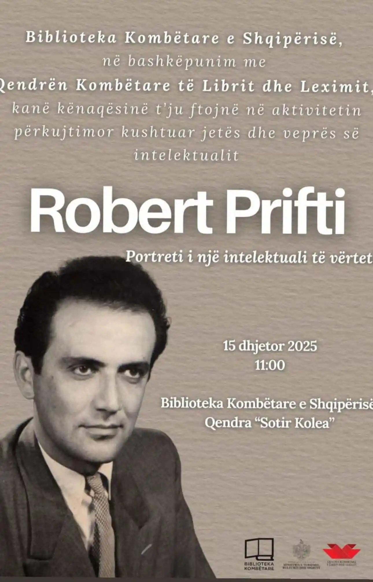 Aktivitet përkujtimor “Robert Prifti” Portret i një intelektuali të vërtetë te Qendra Sotir Kolea + Add to Google Calendar + iCal / Outlook export Date 15/12/2025 Time 11:00 Çmimi Hyrje e lirë Location Salla "Sotir Kolea", Biblioteka Kombëtare Rruga e Elbasanit, Tiranë Kategorite Takim/Konferenca Share this event