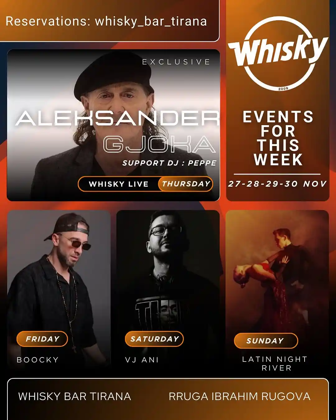 Aleksandër Gjoka, DJ Boocky, VJ Ani, Nata latine te “Whisky Bar” Tiranë Live music, DJs & Latin beats ! See you this week! ❤️🔥 + Add to Google Calendar + iCal / Outlook export Date 28/11/2025 Time 21:00 Location "Whisky Bar" Tiranë Kategorite Muzikë Night Life Organizer "Whisky Bar" Tiranë Share this event