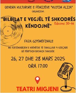 Qendra Kulturore e Fëmijëve “Kujtim Alija” organizon edicionin e 30-të të “Bilbilat e Vegjël të Shkodrës këndojnë” 🎤🎼. Faza gjysmëfinale do të mbahet më 26, 27 dhe 28 mars 2025, ora 17:00 në Teatrin “Migjeni”.