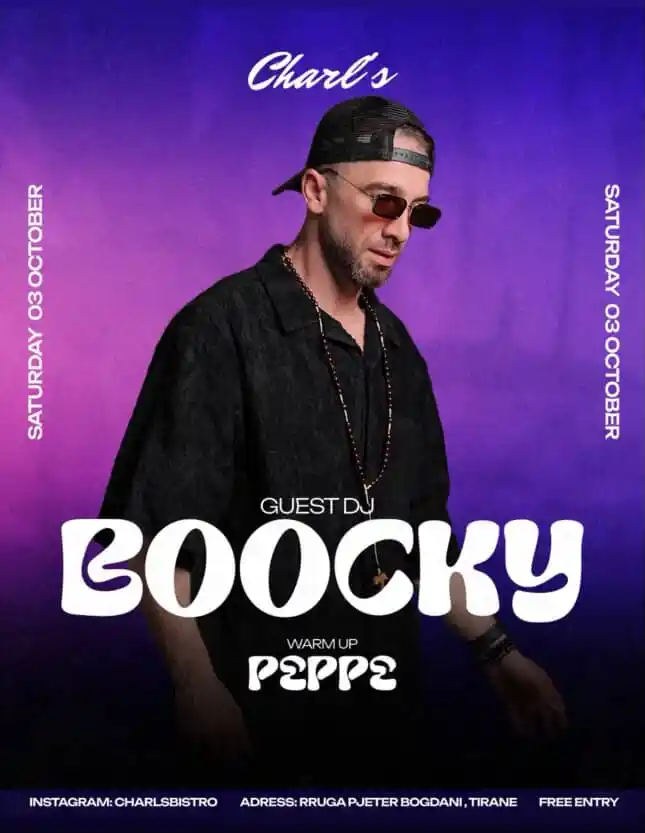 DJ Boocky te “Charls Bistro” Tiranë + Add to Google Calendar + iCal / Outlook export Date 04/10/2025 Aktivitete të Përfunduara Time 21:00 Location Charls Bistro Kategorite Night Life Organizer "Charls Bistro" Tiranë Share this event