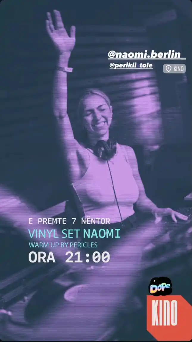 DJ Naomi & DJ Pericles te “Kino” Tiranë + Add to Google Calendar + iCal / Outlook export Date 07/11/2025 Time 21:00 Location Kino Tirana Kategorite Night Life Organizer "Kino", Tiranë Share this event