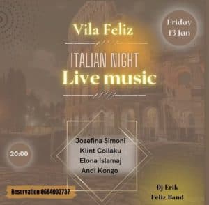 E premtja te “Vila Feliz” me “Italian Night” + Add to Google Calendar + iCal / Outlook export Date 13/01/2023 Aktivitete të Përfunduara Time 21:00 Location Vila Feliz Share this event