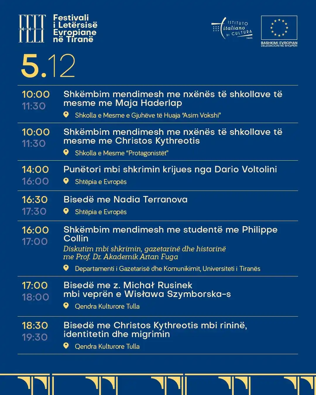 Nga datat 2–6 dhjetor takohemi për një maratonë leximesh, bisedash dhe aktivitete me autorë nga Evropa, në disa pika të qytetit.