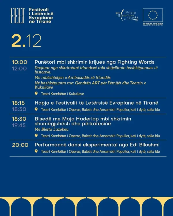 Nga datat 2–6 dhjetor takohemi për një maratonë leximesh, bisedash dhe aktivitete me autorë nga Evropa, në disa pika të qytetit.