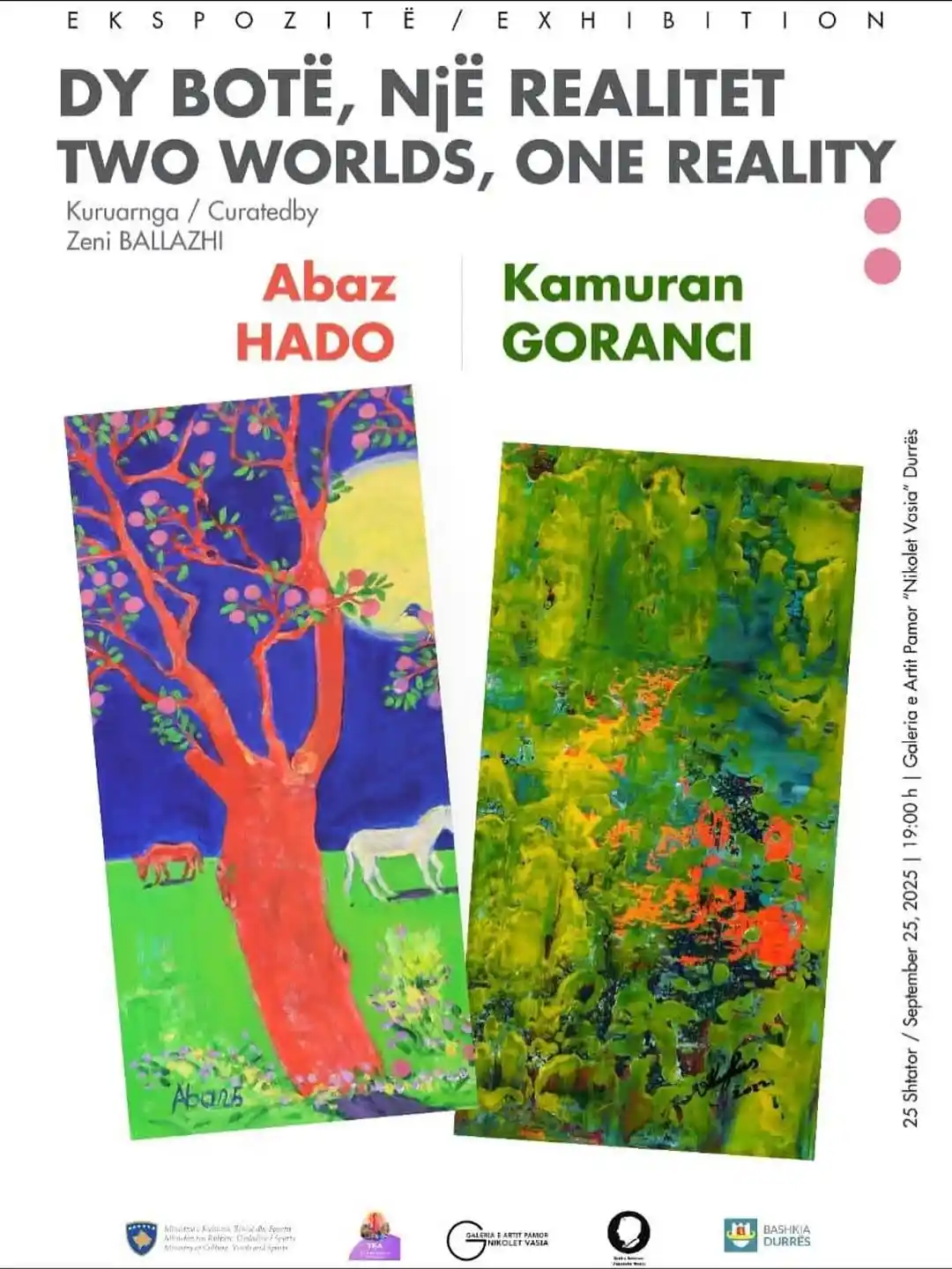 🔜 Ekspozita “Dy botë, një realitet” ndërton një dialog ndërmjet dy universesh krijues, të cilët, ndonëse të ndryshëm në gjuhë shprehëse dhe teknikë, takohen në të njëjtin horizont estetik: atë të përjetimit të transformuar të realitetit. Njëra qasje i referohet figuracionit poetik të natyrës, tjetra ngurtëzimit të ngjyrës në abstraksion monokromatik. Në këtë ndërthurje, arti shfaqet jo si pasqyrë e botës, por si mënyrë për ta rishfaqur dhe ripërjetuar atë.