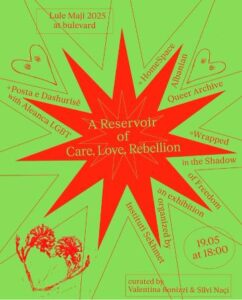 A Reservoir of Care, Love, Rebellion is a proposal for a commons shared between local and diasporic communities through art, activism, and the archive. The project brings three elements into dialogue: HomeSpace, the first public archive to preserve Albanian queer heritage; the iteration of the show Wrapped in the Shadow of Freedom, which explores queerness and its contemporary complexities, first shown in Prishtina and organized by Sekhmet Institute; and Posta e Dashurisë, an ongoing weekly gathering organized by bulevard in partnership with Aleanca LGBT and in conversation with Silvi Naçi, focused on communal care through letter writing, artists presentation and a shared meal.