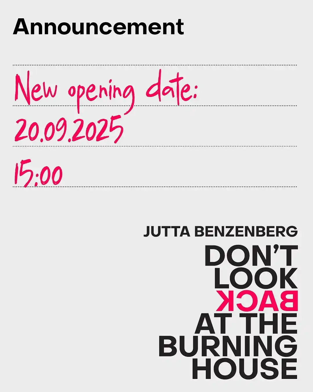 Due to unforeseen circumstances beyond our control, we have made the decision to postpone the opening of the exhibition Jutta Benzenberg: Don’t Look Back at the Burning House. This will allow us to ensure the quality of our work and the experience we wish to share with you.