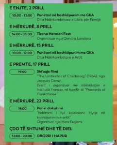 Bëhuni pjesë e punëtorive në bashkëpunim me Galerinë Kombëtare të Arteve për Ditën Ndërkombëtare të Librit për Fëmijë dhe Ditën Botërore të Artit, argëtohuni në Tirana HarmoniFest, shijoni një mbrëmje unike me filmin muzikor The Umbrellas of Cherbourg nga Jacques Demy në kuadër të “Pranverës së Frankofonisë”, si dhe bëhuni pjesë e panelit mbi koleksionimin e artit.