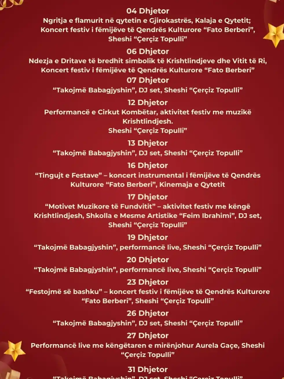 Eventet festive të muajit dhjetor në Gjirokastër KALENDARI I AKTIVITETEVE DHJETOR 2025🎄🥳🎁 + Add to Google Calendar + iCal / Outlook export Date 12/12/2025 Time 12:00 Location Gjirokaster Kategorite Koncert Muzikë Share this event