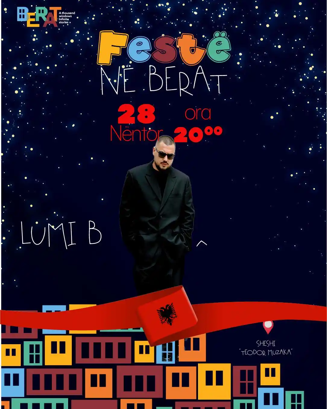 Festë në Berat me LUMI B 28 Nëntori në Christmas Market ndizet 🔥 me Lumi B 😍 #DTAJuDo❤️ + Add to Google Calendar + iCal / Outlook export Date 28/11/2025 Time 20:00 Çmimi Hyrje e lirë Location Sheshi "Teodor Muzaka", Berat Kategorite Muzikë Night Life Performancë Share this event