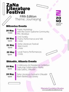 Jemi të lumtur të ndajmë me ju programin e edicionit të 5-të të Festivalit të Letërsisë ZaNa, me temën “Udhëtimi.” Nga punëtoritë poetike dhe performancat në Mitrovicë, deri te ekspozitat dhe leximet në Shkodër – bashkohuni me ne për pesë ditë të mbushura me letërsi dhe frymëzim!