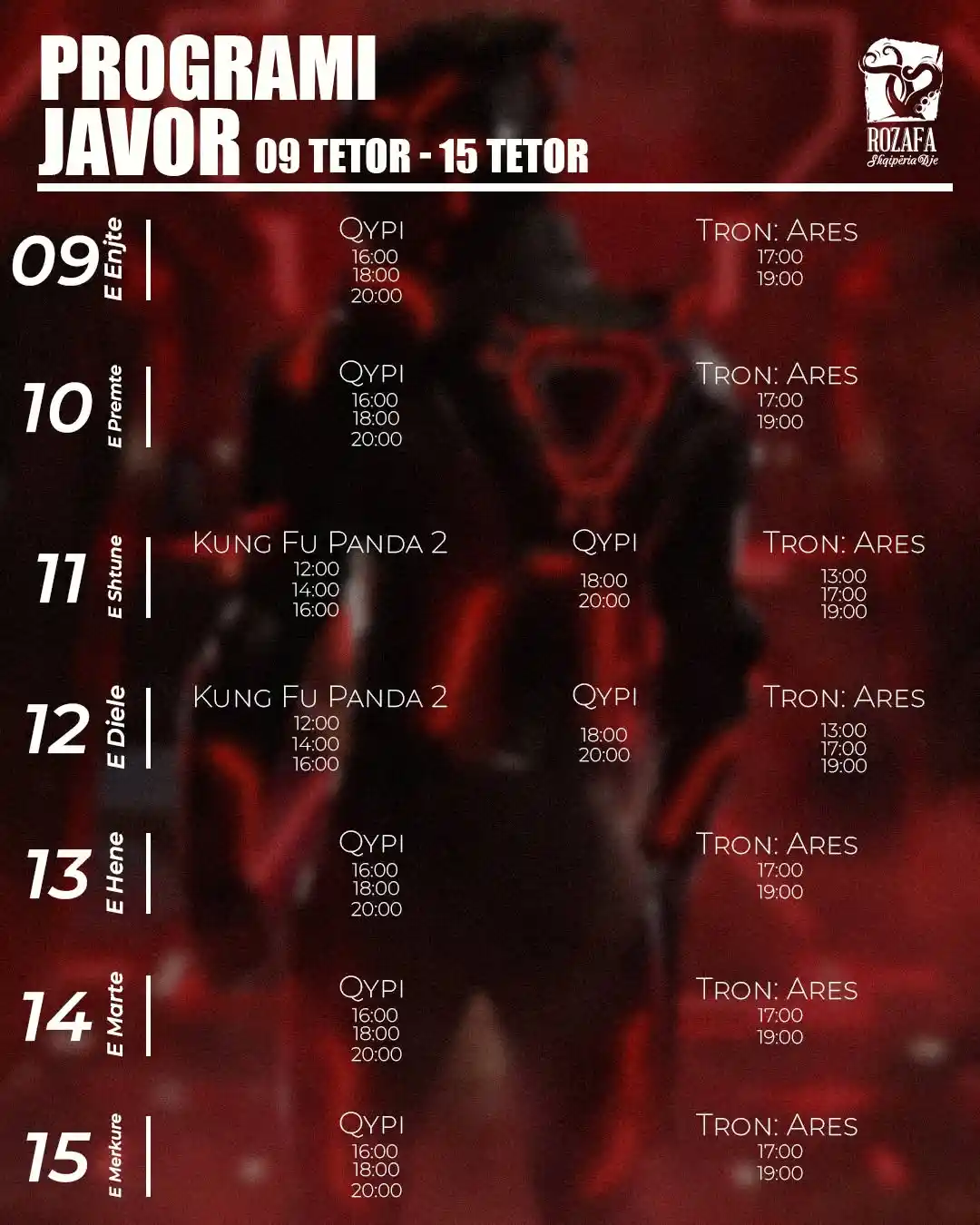 Filmat e javës te Kinema “Rozafa” Elbasan 🍿PROGRAMI JAVOR🍿 + Add to Google Calendar + iCal / Outlook export Date 10/10/2025 Time 16:00 - 20:00 Location Kinema Rozafa Elbasan Kategorite Film Share this event