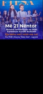 Më 21 Nëntor, në Ditën Kombëtare Kundër Bullizmit, do të organizojmë një aktivitet të veçantë në Kinema “Maks Velo”, në orën 17:00, ku do të shfaqet filmi i shkurtër “Ftesa” 🎥, që trajton ndikimin e bullizmit dhe rëndësinë e mbështetjes për të rinjtë.