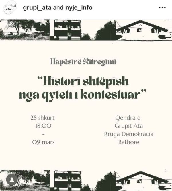 Seria e audio-videove të ‘Histori shtëpish nga qyteti i kontestuar’, përkrahur nga British Council, përpos publikimit në webin e nyjes, do të ketë dhe hapësirën e vet të ri-paraqitjes te qendra e grupit Ata. Çelja e saj do të jetë me datë 28 shkurt, në orën 18.00, në Bathore. Ky prezantim do të qëndrojë hapur për vizita dhe takime për të gjithë të interesuarit deri me datë 9 mars.