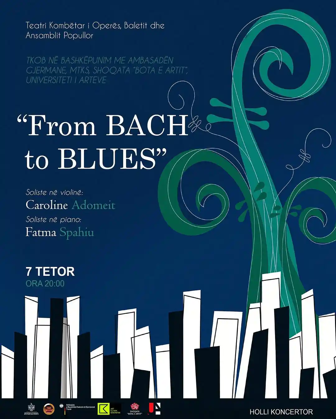 Violinistja e mirënjohur gjermane, Caroline Adomeit, vjen në TKOBAP së bashku me pianisten shqiptare Fatma Spahiu, për t’ju dhuruar një recital, i cili na shpie në një udhëtim nga tingujt e pavdekshëm të Johann Sebastian Bach, tek ngjyrimet impresioniste të Ravel, arranxhime të vetë artistes Adomeit, vepra të Kosturit si edhe pjesë shqiptare për violinë.