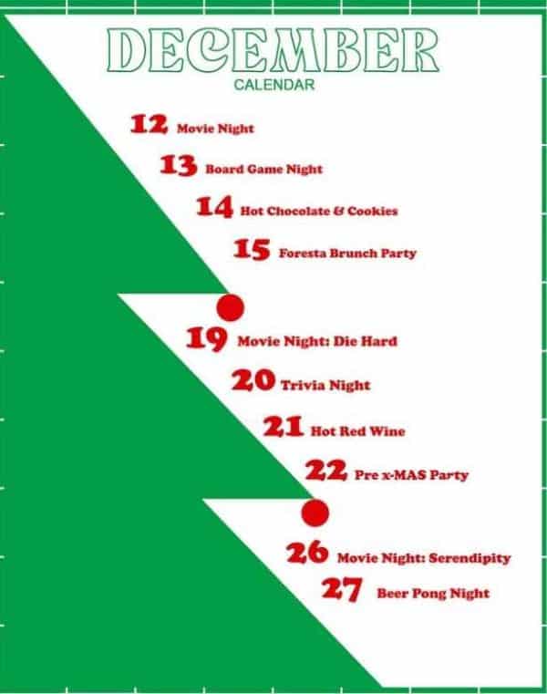 #foresta #decembercalendar #brunch #movienight #boardgame #trivianight #hotredwine #beerpong #prexmasparty #christmasspirit #intheforest