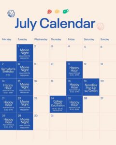 July Calendar is hereee, with lots of love, creativity, fun and chill nights, also for the painting club meetings join the group for weekly announcements.