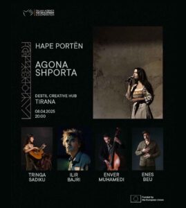 Join Agona Shporta as she presents her latest album, Hape Portën, sharing the stage with an incredible lineup of musicians: Tringa Sadiku (guitar), Ilir Bajri (piano), Enver Muhamedi (bass), and Enes Beu (drums). Experience a night of Albanian folk songs reimagined on April 8, 2025, at 20:00 at Destil Creative Hub.