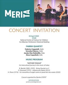 Ne Teatrin e Kukullave te Tiranes, ne ndertesen historike te Parlamentit te pare Shqiptar, ne date 3 Prill, ora 19, kuarteti i harqeve FABRIK, me baze ne Frankfurt, Gjermani do te luaje ne kuadër te projektit MERITAPLATFORM, nje koncert të organizuar mbi bazen e nje “udhetimi” nderkulturor me muzikë moderne e bashkekohore.