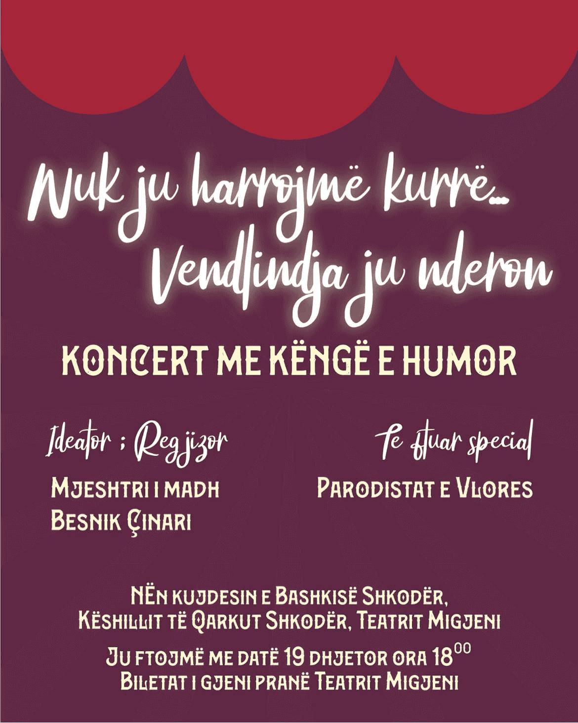 Koncert “Nuk ju harrojmë kurrë – Vendlindja ju nderon” në Shkodër Të mirëpritur + Add to Google Calendar + iCal / Outlook export Date 22/12/2024 Aktivitete të Përfunduara Time 19:00 Location Teatri Migjeni Shkoder Kategorite Koncert Muzikë Share this event