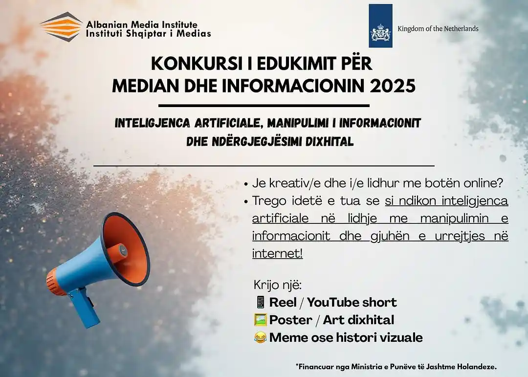 📲 Apliko këtu: https://institutemedia.org/thirrje-per-konkursin-e-edukimit-per-median-dhe-informacionin-2025-inteligjenca-artificiale-ia-manipulimi-i-informacionit-dhe-ndergjegjesimi-dixhital/?fbclid=PAZXh0bgNhZW0CMTEAAactw1_yxVnL8Scf41wP2pgRAV15QZ8gGY0y45Nw9CEgW3VpGs9fJbzveLTwhw_aem_NmvT6zmYmQpVuW2QgPZUxQ