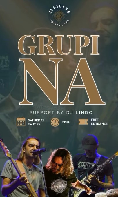 Live music nga Grupi NA te Juliette Cocktail Bar + Add to Google Calendar + iCal / Outlook export Date 06/12/2025 Time 21:00 Çmimi Hyrje e lirë Location Juliette Cocktail Bar Kategorite Muzikë Night Life Performancë Share this event