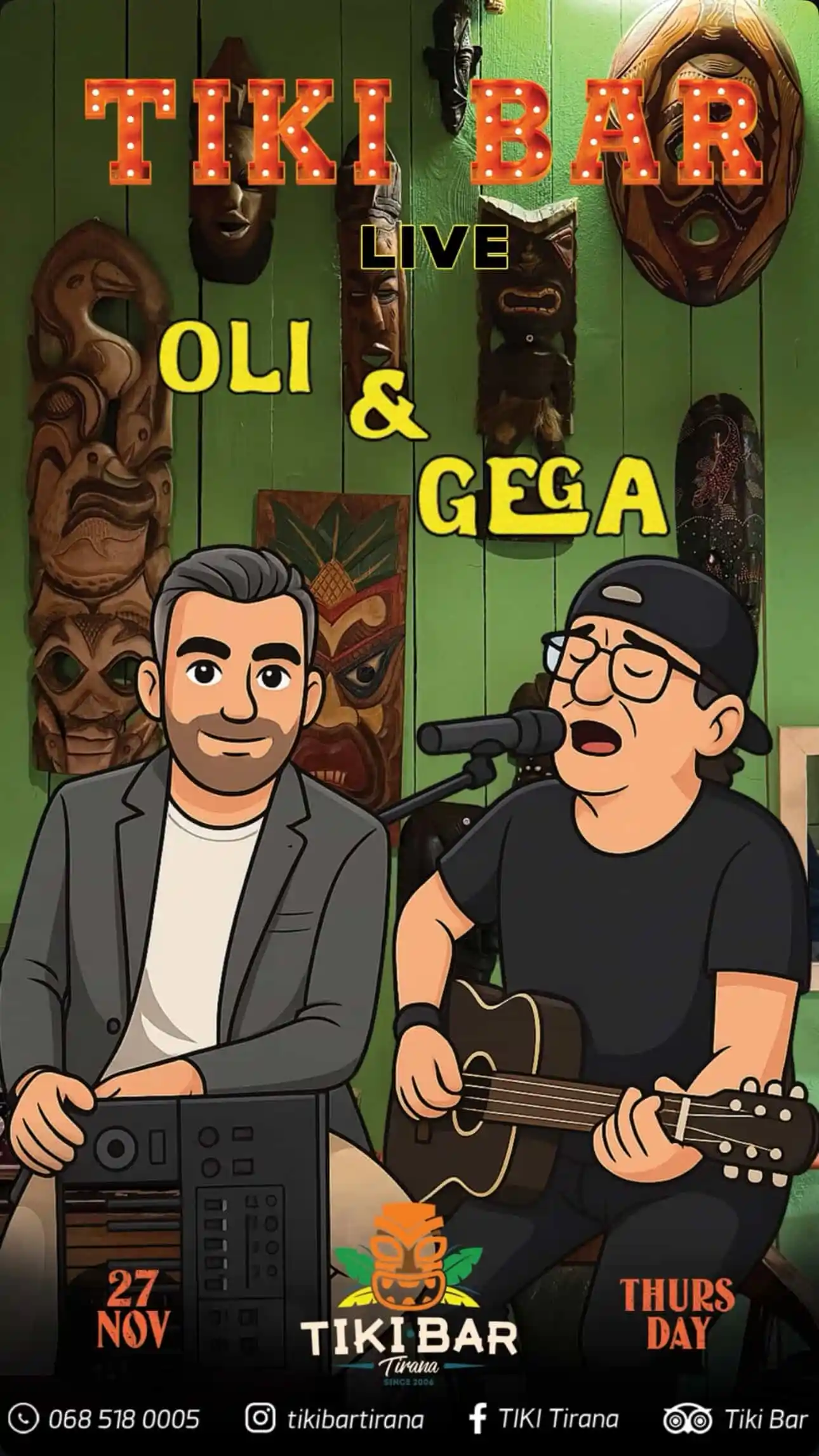 Live music nga Oli & Gega te TIKI BAR + Add to Google Calendar + iCal / Outlook export The event is finished. Date 27/11/2025 Aktivitete të Përfunduara Time 21:00 Çmimi Hyrje e lirë Location Tiki Bar Tirana Kategorite Muzikë Night Life Performancë Share this event