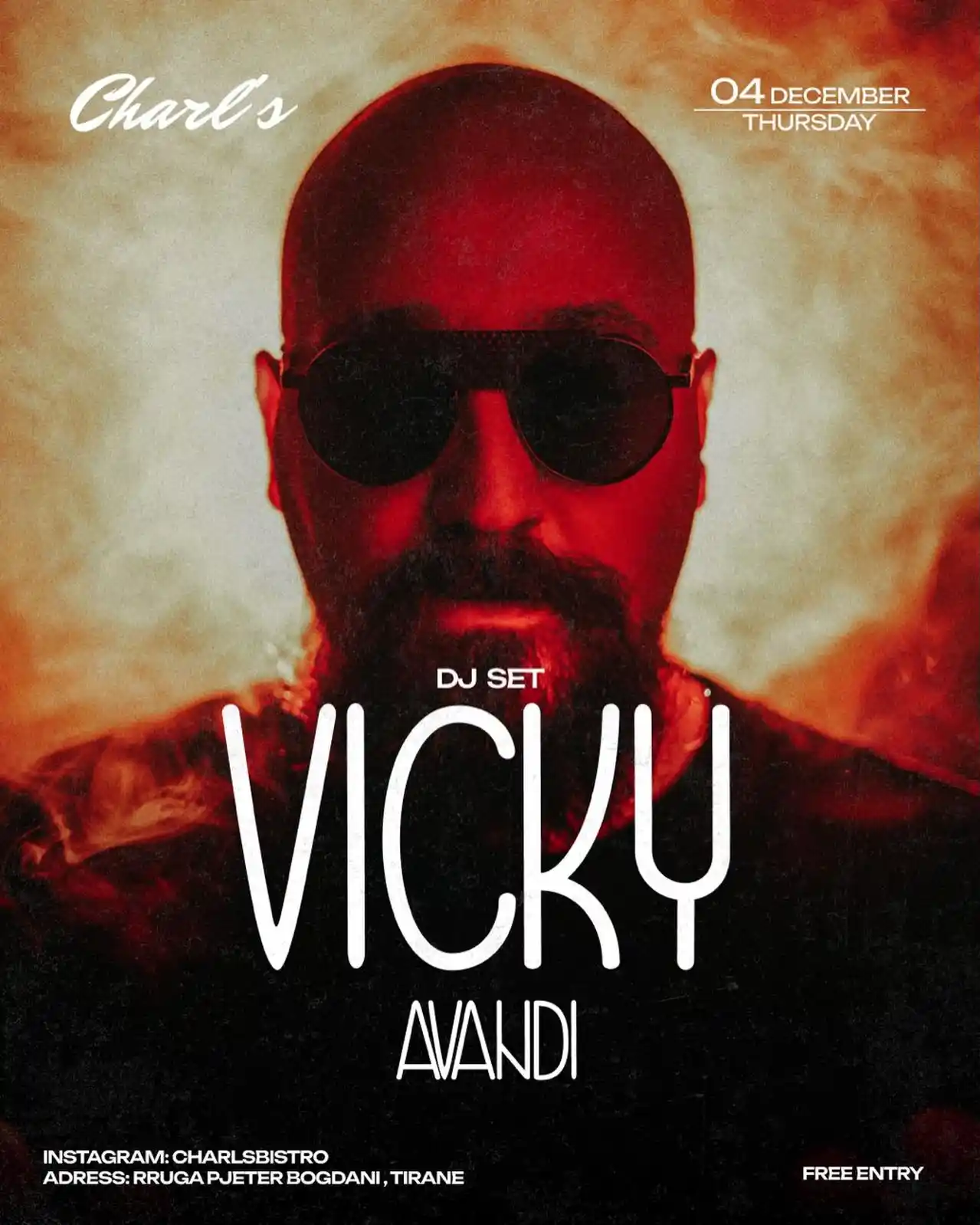 Live set nga DJ VICKY te Charl’s Bistro + Add to Google Calendar + iCal / Outlook export Date 04/12/2025 Time 21:00 Çmimi Hyrje e lirë Location Charls Bistro Kategorite Muzikë Night Life Performancë Share this event