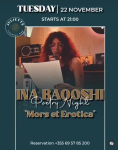 Te marten ora 21:00 te Juliette Cocktail Bar do te kete mbremje poetike me Ina Baqoshin
