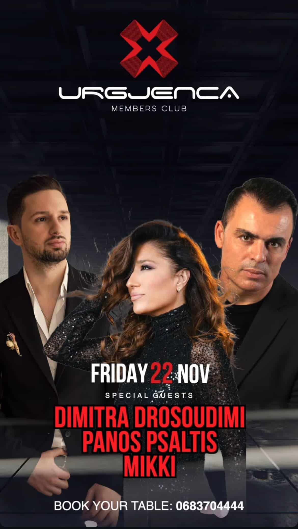 Muzikë greke me Dimitra Drosoudimi, Panos Psaltis, Mikki te “Urgjenca Club” Tiranë + Add to Google Calendar + iCal / Outlook export Date 22/11/2024 Aktivitete të Përfunduara Time 23:55 Location Urgjenca Club Tirana Kategorite Night Life Share this event