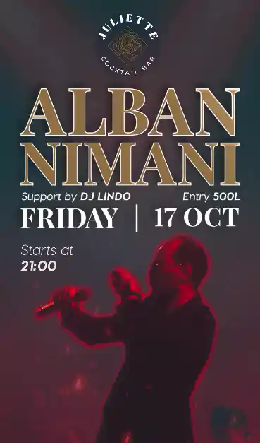 Muzikë live nga Alban Nimani te “Juliette Cocktail Bar” Tiranë Te Premten i Ftuar Special @albannimani 🥂 #livemusic #bar #tirana #dj #cocktailbar 🍸 + Add to Google Calendar + iCal / Outlook export Date 17/10/2025 Aktivitete të Përfunduara Time 21:00 Çmimi 500 lekë Location Juliette Cocktail Bar Kategorite Muzikë Night Life Organizer “Juliette Cocktail Bar”, Tiranë Share this event
