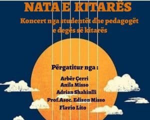 1 Qershor 2024, ora 18:00- Nata e kitarës, koncert nga studentët dhe pedagogët e degës së kitarës, Arbër Çerri, Anila Misso, Adrian Shahinlli, Prof. Asoc. Edison Misso, Flavio Lito.