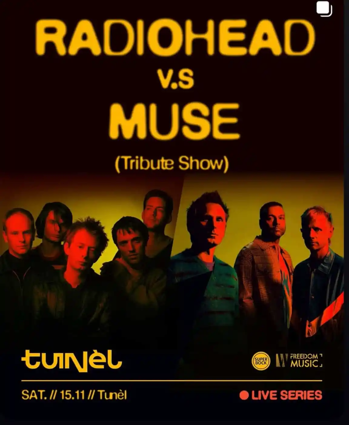 This Saturday at Tunèl ⚡️Experience the ultimate Tribute Show – a night dedicated to two of the greatest bands of our time. 🎤 Radiohead vs MUSE