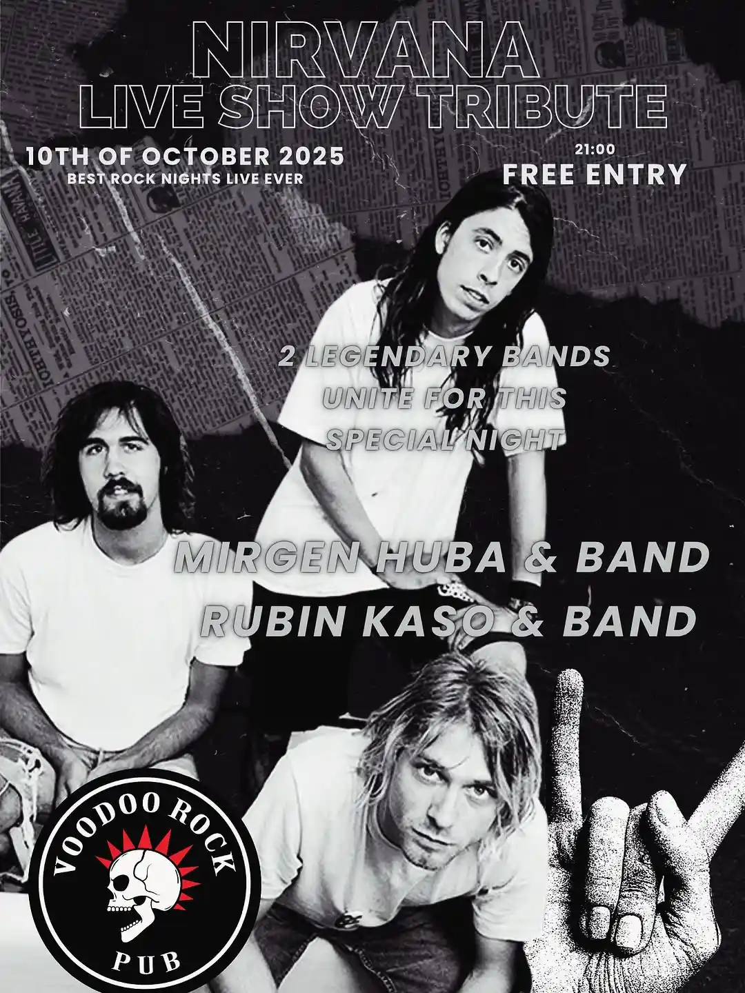 Two of Tirana’s most legendary bands, Mirgen Huba & Band and Rubin Kaso & Band, unite to set the Voodoo Rock Pub stage on fire for one of our most iconic themes ever — a tribute to the raw soul of Nirvana.