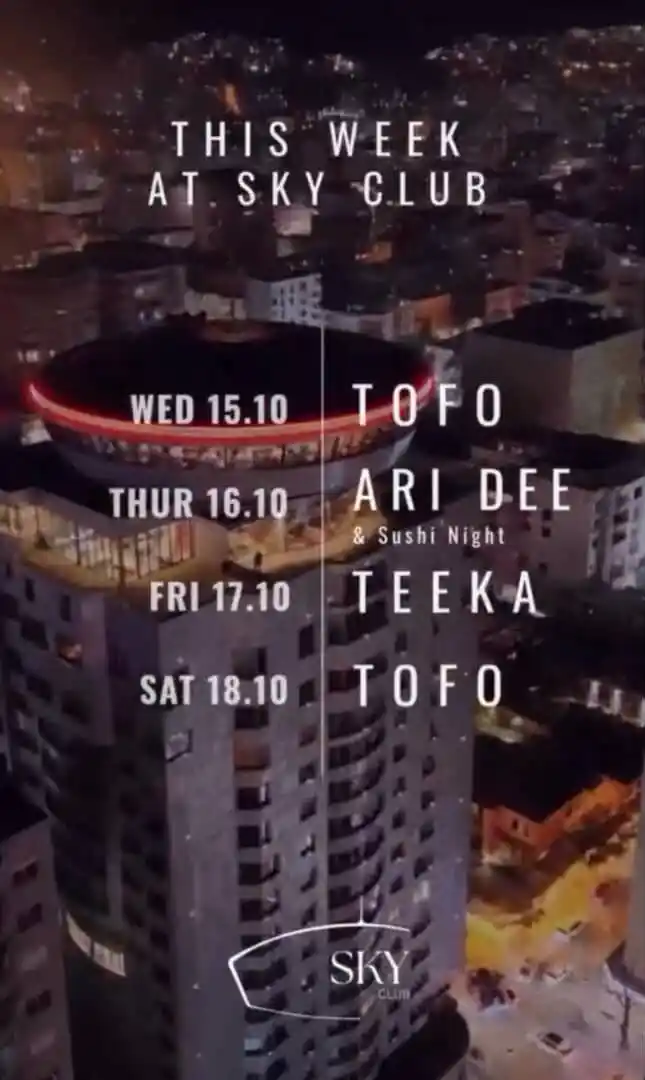Përzgjedhja muzikore e javës te “Sky Club” Tiranë See you at 9PM. + Add to Google Calendar + iCal / Outlook export Date 18/10/2025 Time 21:00 - 21:00 Location "Sky Club" Tiranë Kategorite Night Life Share this event