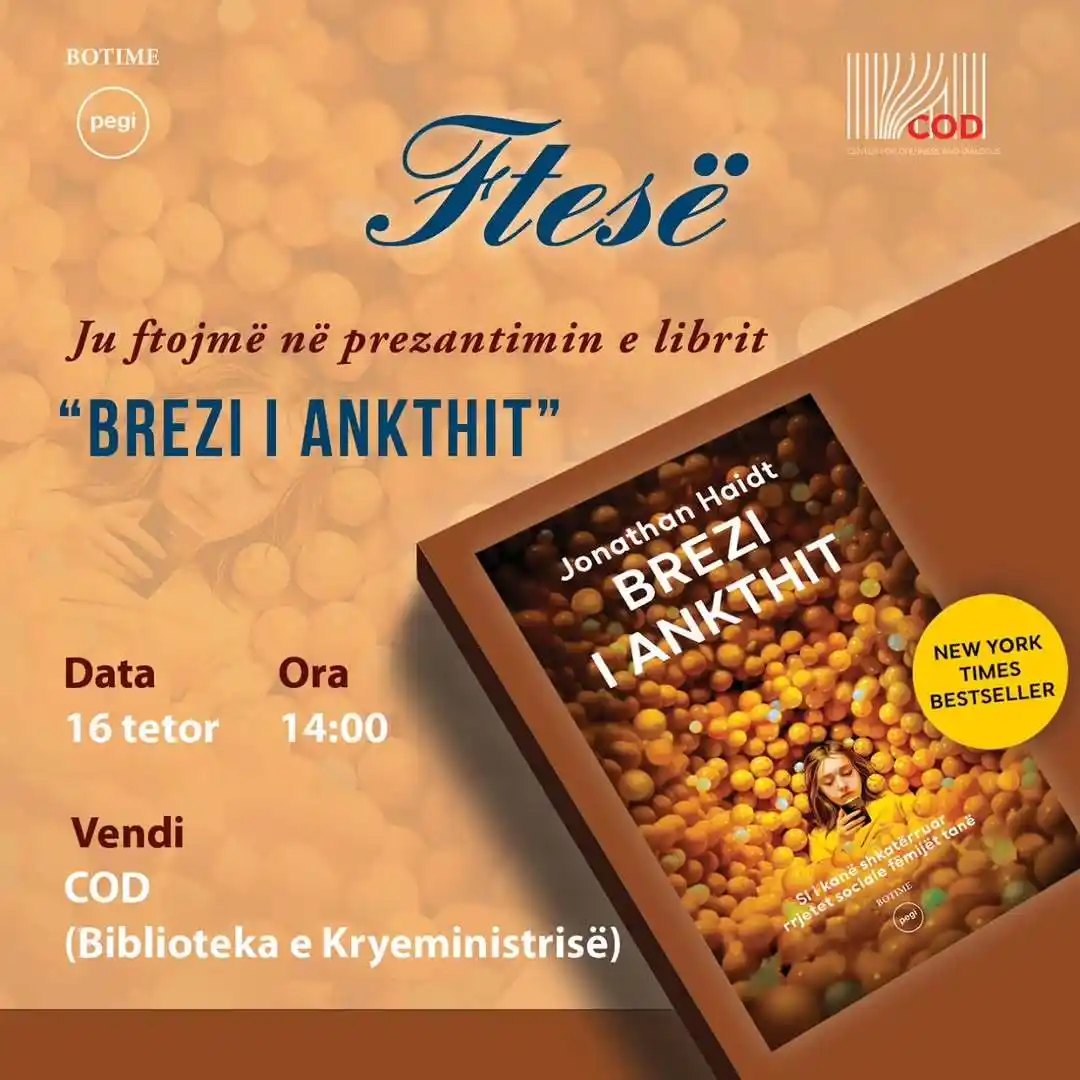 Qendra për Hapje dhe Dialog (COD), në bashkëpunim me shtëpinë botuese Pegi, ju fton të merrni pjesë në prezantimin e librit më të diskutuar të momentit – “Brezi i Ankthit”, një New York Times Bestseller që po trondit debatet mbi ndikimin e rrjeteve sociale te fëmijët dhe të rinjtë.