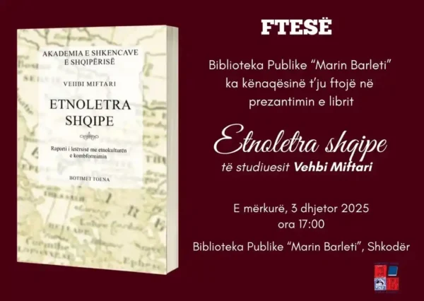 📚 Biblioteka Publike “Marin Barleti”, ka kënaqësinë t’ju ftojë në prezantimin e librit “Etnoletra shqipe”, të studiuesit Vehbi Miftari