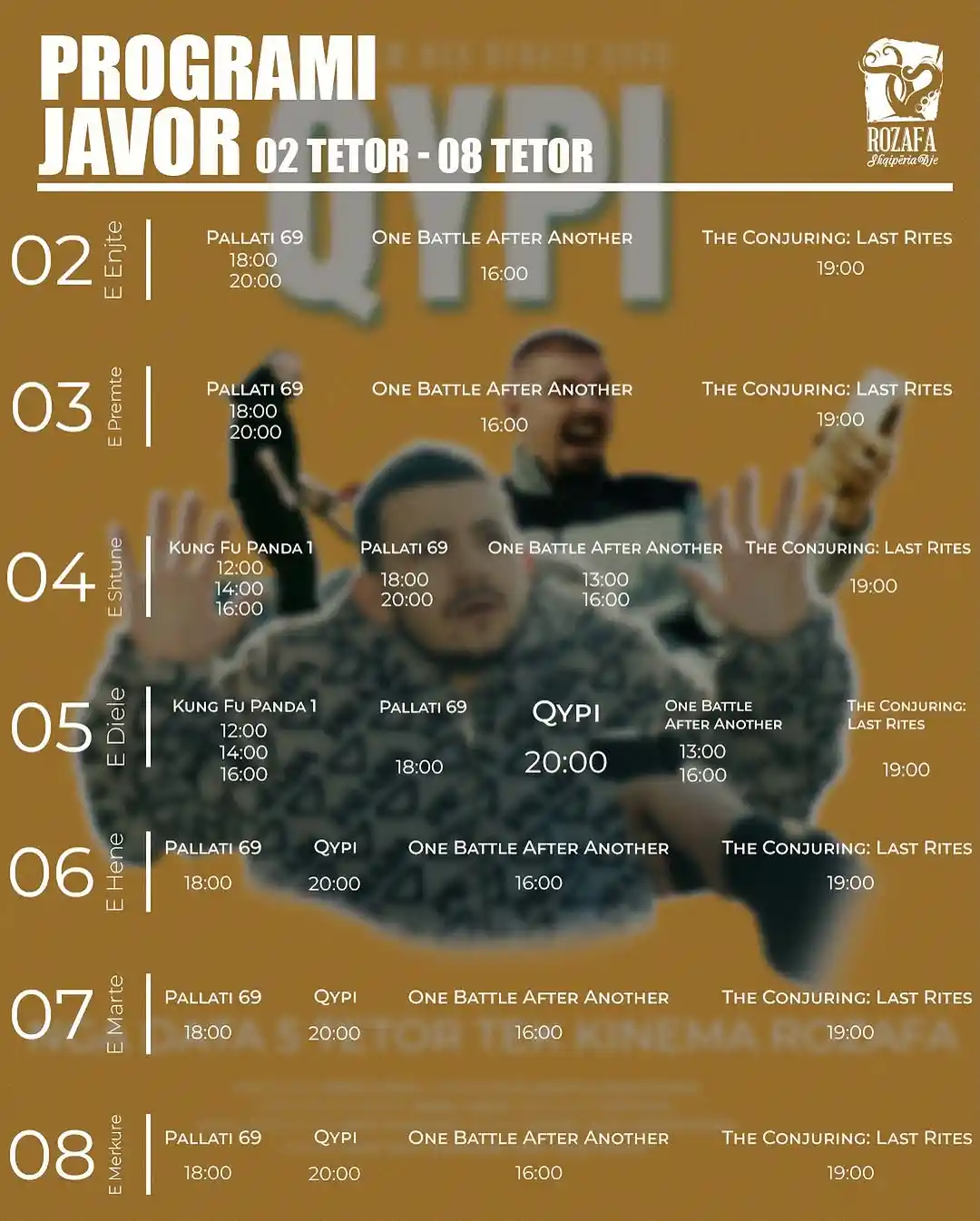 Programi javor i filmave te Kinema “Rozafa” Elbasan đżPROGRAMI JAVORđż + Add to Google Calendar + iCal / Outlook export Date 07/10/2025 Aktivitete tĂ« PĂ«rfunduara Time 16:00 Location Kinema Rozafa Elbasan Kategorite Film Share this event