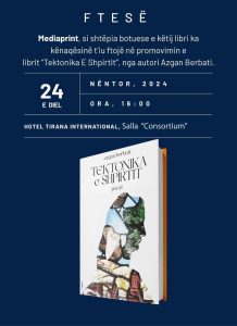 Më datë 24 nëntor (ditë e diel) 2024, ora 16:00, tek Hotel Tirana International (15 katëshi), në sallën “Consortium” promovohet libri “Tektonika E Shpirtit” nga Azgan Berbati
