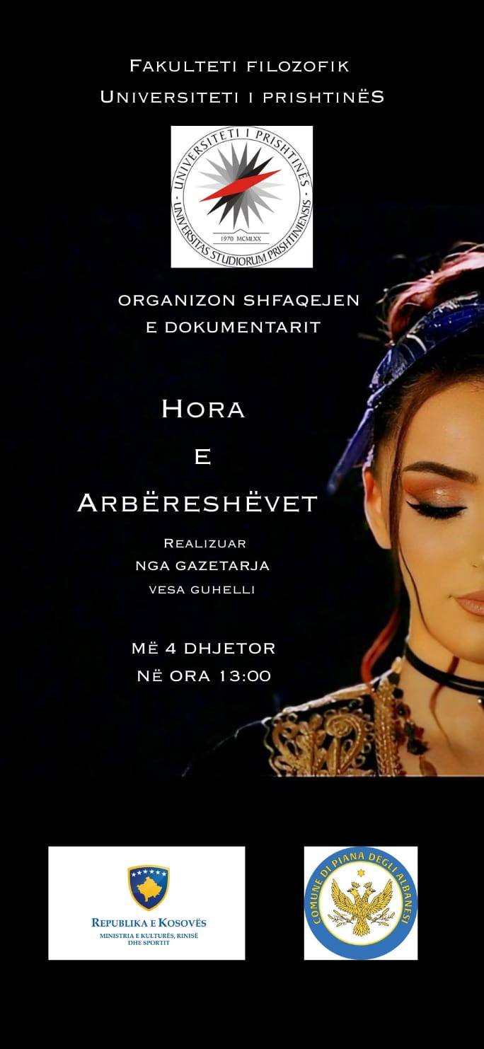 Ju njoftojmë se më 4 dhjetor, në ora 13:00, në Fakultetin Filozofik do të shfaqet dokumentari “Hora e Arbëreshëvet”, realizuar nga gazetarja Vesa Guhelli.