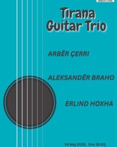 Në kuadrin e Stines Koncertore 2025 Fakulteti i Muzikës, ju fton në një koncert interesant Trio kitara, me instrumentistët Arber Çerri Aleksandër Braho dhe Erlind Hoxha te cilet do te sjellin per publikun nje repertor të larmishëm dhe të këndshëm.