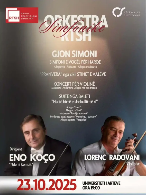 🎶Orkestra Simfonike e RTSH sjell një mbrëmje të veçantë kushtuar krijimtarisë së kompozitorit GJON SIMONI, nën drejtimin e dirigjentit ENO KOÇO “Nderi i Kombit” dhe me pjesëmarrjen e violinistit LORENC RADOVANI.