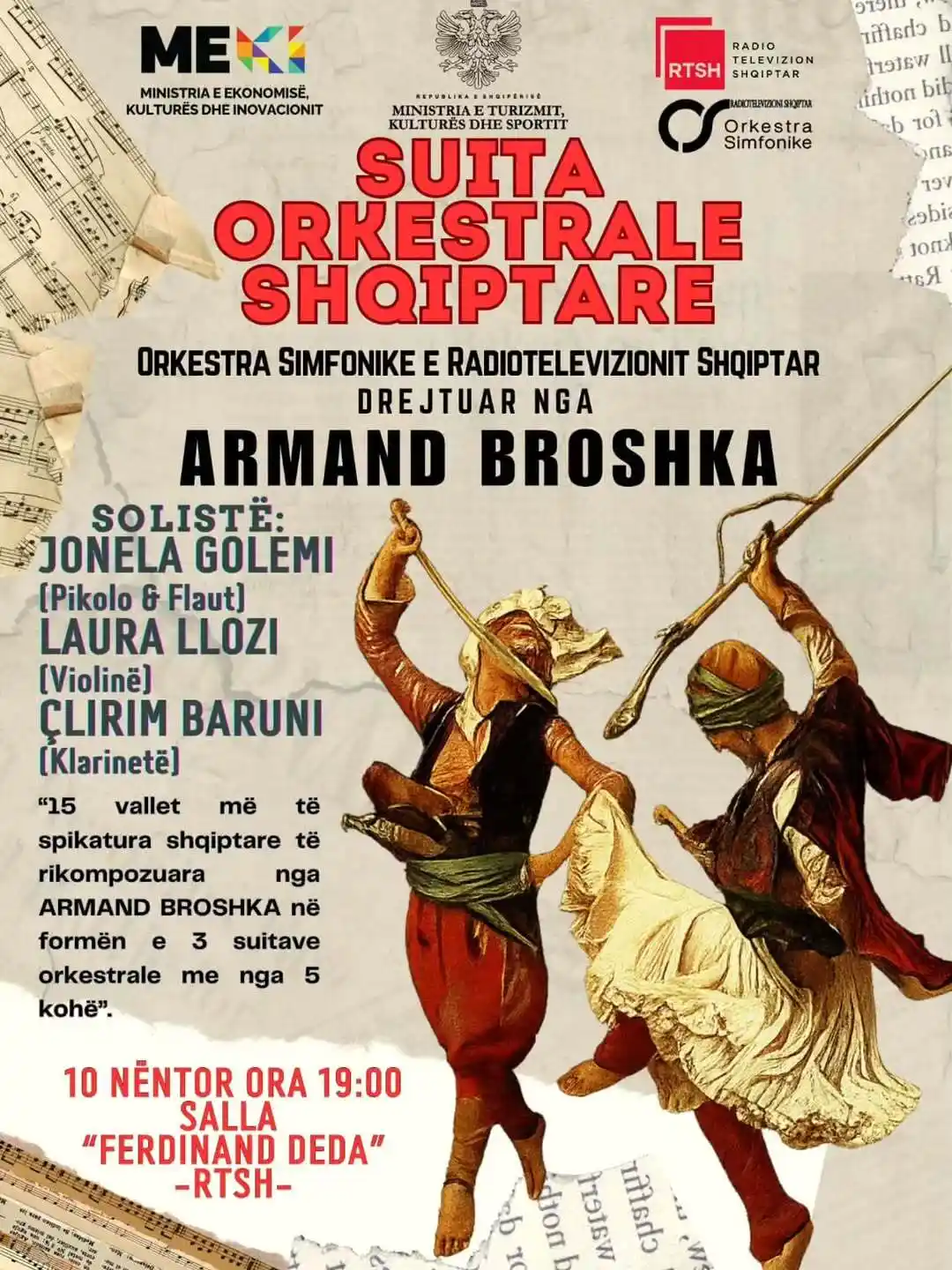 🇦🇱“Suita Orkestrale Shqiptare” e mbështetur nga Ministria e Turizmit, Kulturës dhe Sportit, sjell në skenë krijimin origjinal të tre suitave orkestrale me nga pesë kohë secila, ku bashkon trashëgiminë e valleve më të spikatura shqiptare me madhështinë baroke evropiane. Vallet e Tropojës, Kukësit, Matit, Krujës, Tiranës, Korçës, Çamërisë, si edhe ato të arbëreshëve dhe arvanitasve, marrin jetë përmes një rikonceptimi kompozicional që ruan identitetin folklorik dhe e ngre në nivel koncertal simfonik.