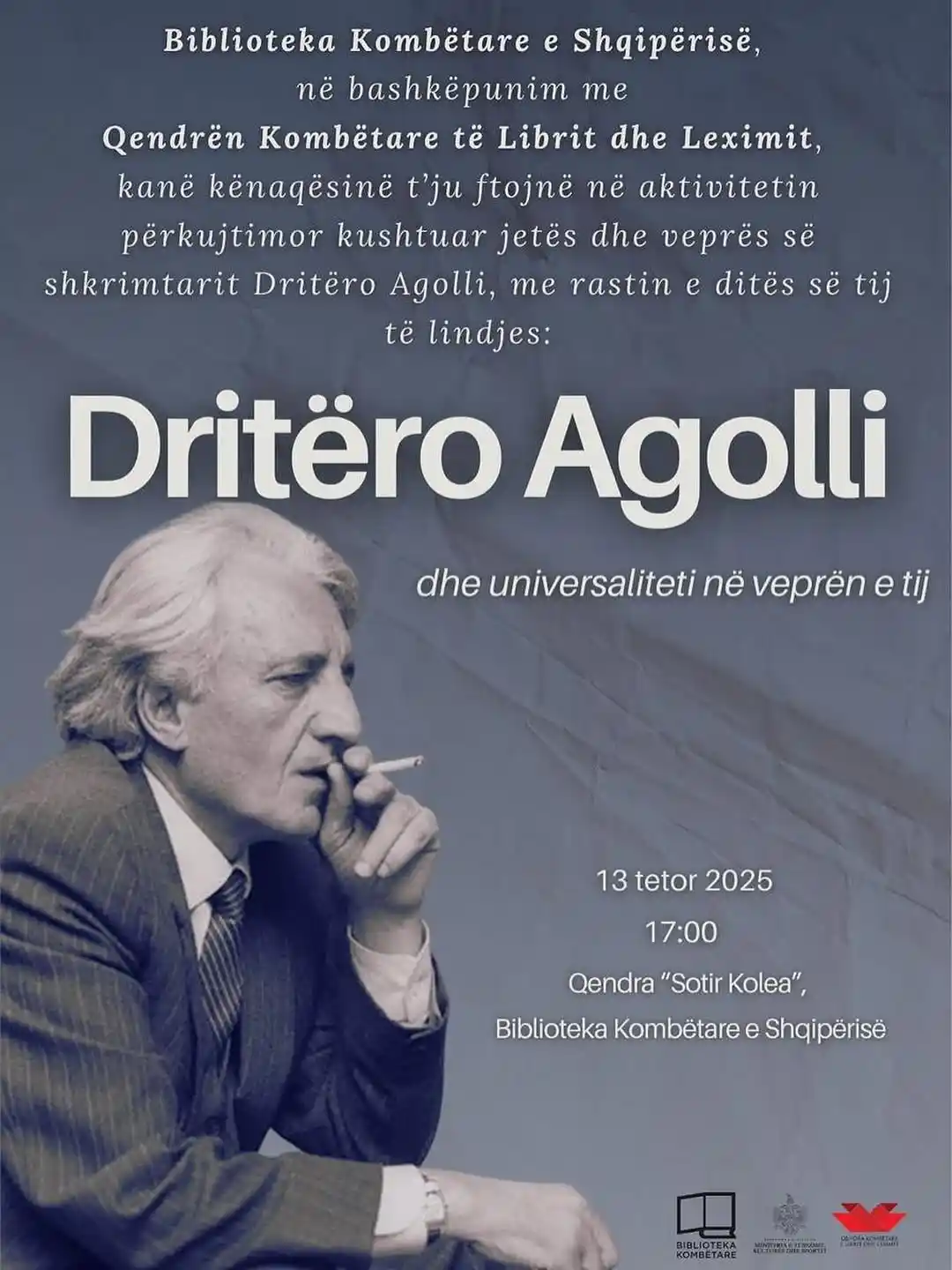 📚 Biblioteka Kombëtare e Shqipërisë në bashkëpunim me Qendrën Kombëtare të Librit dhe Leximit, ju fton të merrni pjesë në aktivitetin përkujtimor kushtuar jetës dhe veprës📝 së shkrimtarit të madh✍🏻 Dritëro Agolli, me rastin e ditës së tij të lindjes.