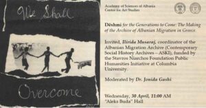 The Centre for Art Studies (CAS) is pleased to announce that next Wednesday, 30 April 2025, starting at 11:00 am, Ilirida Musaraj will be speaking to Dr. Jonida Gashi about her work as project coordinator of the Archive of Albanian Migration in Greece, at the “Aleks Buda” Hall in the Academy of Sciences of Albania. The Archive of Albanian Migration in Greece is a pilot project undertaken by the Contemporary Social History Archives (ASKI), with support from the Stavros Niarchos Foundation Public Humanities Initiative (SNFPHI) at Columbia University. Its goal is to map existing resources on Albanian migration to Greece, to create new ones, and to amplify the voices and lived experiences of Albanian migrants, while also highlighting a significant yet often overlooked chapter in contemporary Greek history. The project has served as an experiment in building contemporary migration archives in Greece, raising critical questions: What does a migration archive in the making look like? What materials, themes, and stories should it include? What dilemmas emerge along the way? And how might such an archive interconnect the past, the present, and the future?