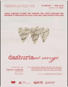Poetja Laureate, Rita Petro në bashkëpunim me Qendrën Kombëtare të Librit dhe Leximit organizon një mbrëmje poetike me temë “Dashuria në vargje” , ku do të ketë lexime vargjesh klasike dhe moderne nga poetë shqiptarë dhe botërorë të përkthyer në shqip, si dhe lirikë erotike popullore.