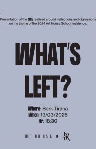 NĂ« oborrin e shtĂ«pise botuese đBerk nĂ« TiranĂ« kemi kĂ«naqĂ«sinĂ« t’ju prezatojmĂ« me njĂ« zine dixhital tĂ« punuar nga artistĂ«t e edicionit tĂ« katĂ«rt tĂ« Art House School 2024 : Jona Krasniqi, SaĆĄa TatiÄ, Luka Cvetkovic, Samela Balazi, Laura Paja, Jozefina Vokrri, Nora Bzheta, Elsamina Musiq, Xhulian Millaj, Nazli Moripek.